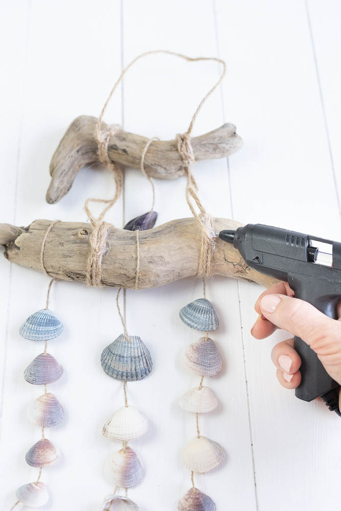 Im nächsten schritt klebt ihr nun die muscheln mit der heißklebepistole auf das jute band.